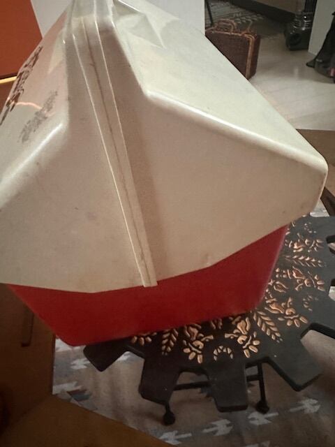 ドイツの老舗ブランドTHERMOS。あまり知られていませんが1950年代から1970年代頃はアウトドアアイテムも扱っていたようでビンテージものではちょいちょい見かけます。こちらのクーラーボックスは購入時は70年代のもの、との事でしたが僕調べでは特定できませんでした。しかしながらTHERMOSのヴィンテージものでよくみられる特徴的なアカシロのカラーリングなのでほぼほぼ間違いないかと思います。数回キャンプで使用してみましたが現代のものに比べると保冷力は劣りますがクーラーBOXとしては機能しますが真夏の炎天下キャンプにはおすすめしません笑。ステッカー跡や表面のキズ・汚れは多数ございますが良き味として楽しめるもので使用に支障を来すダメージはありません。